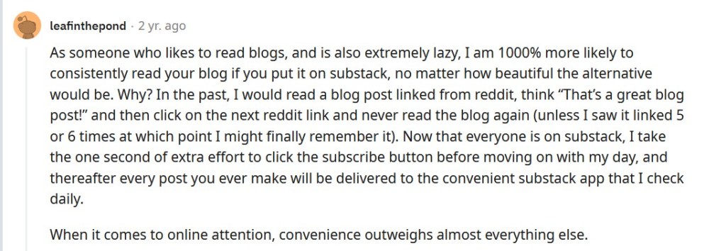 And since I don’t actually care about any of this because I just want to write and be red, I shall duplicate blog posts and link my personal blog at the bottom of each of my Substack posts. Because covenience is king on the internet. Someone on Reddit said it beautifully.