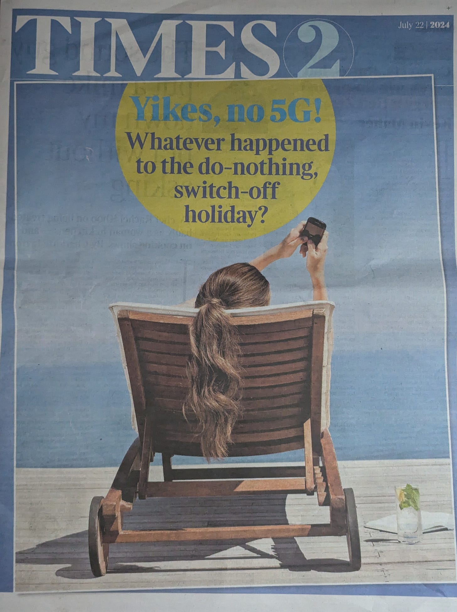 The first thing, I read the newspaper today. I always do, because where I work, they write the newspaper, therefore I can get one anywhere at any time and for free. Today, Monday 22nd of July, 2024, the supplement contained a long article about how corporate people on holidays cannot switch off. At first, I thought it was satire. But it was not.